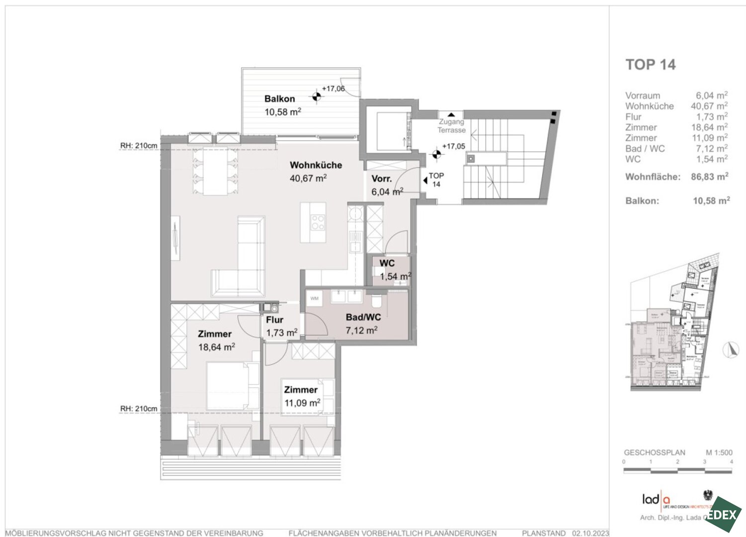 - TOP 14: ca. 86,83 m² große 3-Zimmerwohnung mit ca. 10.58 m² Balkon: EUR 689.000,-