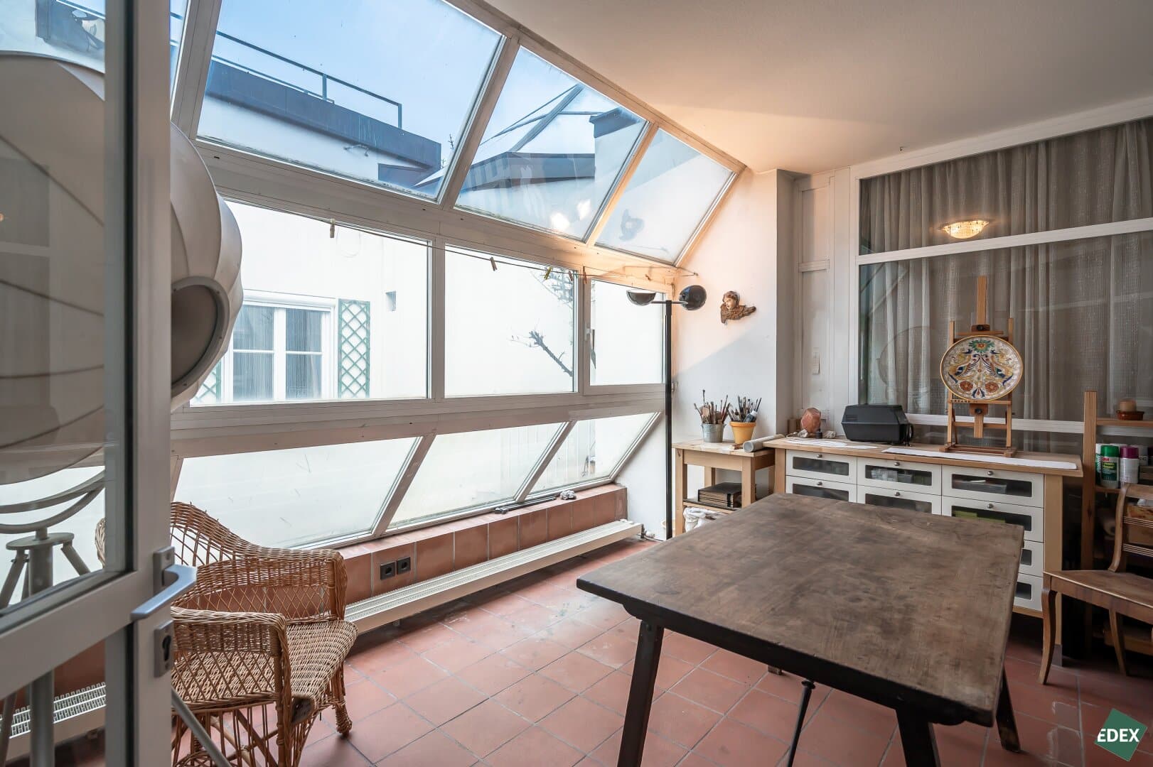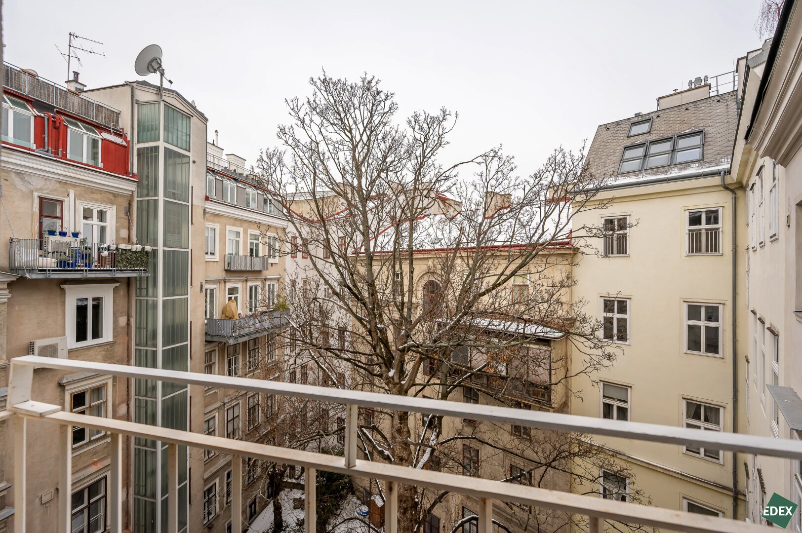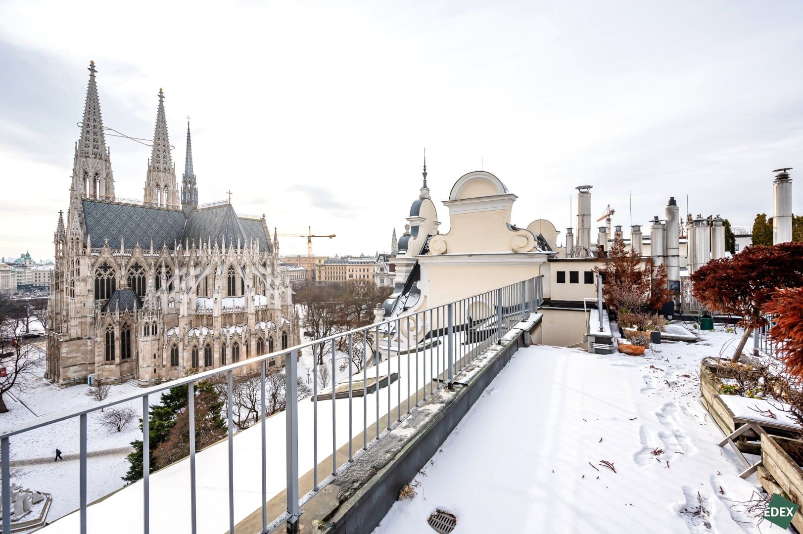 Absolutes Highlight ist die ca. 63 m² große Dachterrasse, die eine unverbaute Sichtachse auf die Votivkirche, Stephansdom und das urbane Panorama Wiens bietet.