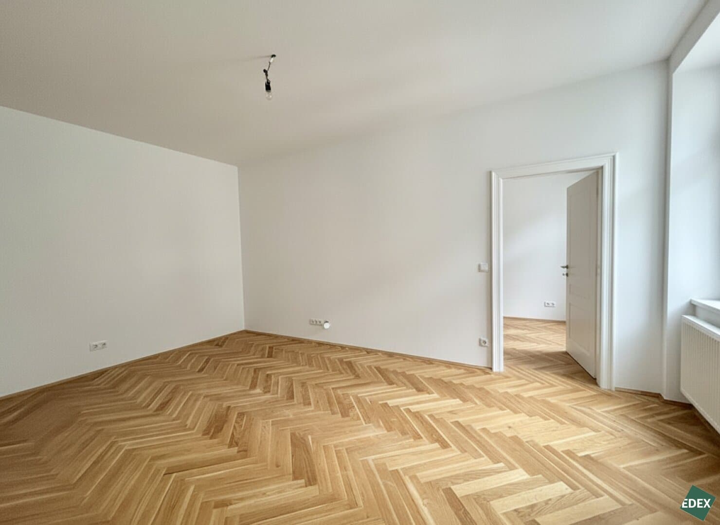 Die Wohnung wurde hochwertig generalsaniert und bietet eine durchdachte Raumaufteilung: Vom Vorraum aus sind sowohl das separate WC mit Fenster als auch das Badezimmer mit Dusche, Waschbecken und Waschmaschinenanschluss erreichbar. Weiters gelangt man vom Vorraum in das Wohnzimmer mit einer Kochnische samt Anschlüssen für eine Küche. Das ca. 13,5 m² große Schlafzimmer ist vom Wohnzimmer aus begehbar. Der Wohnung ist außerdem ein ehemaliges Gang-WC direkt neben dem Wohnungseingang zugeordnet, das nun als praktischer Abstellraum genutzt werden kann.