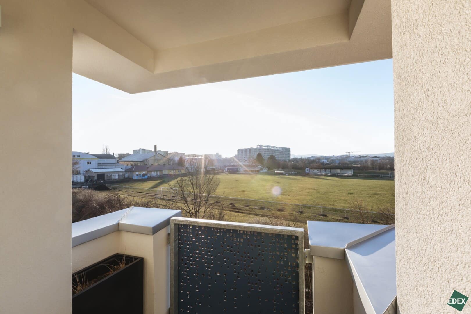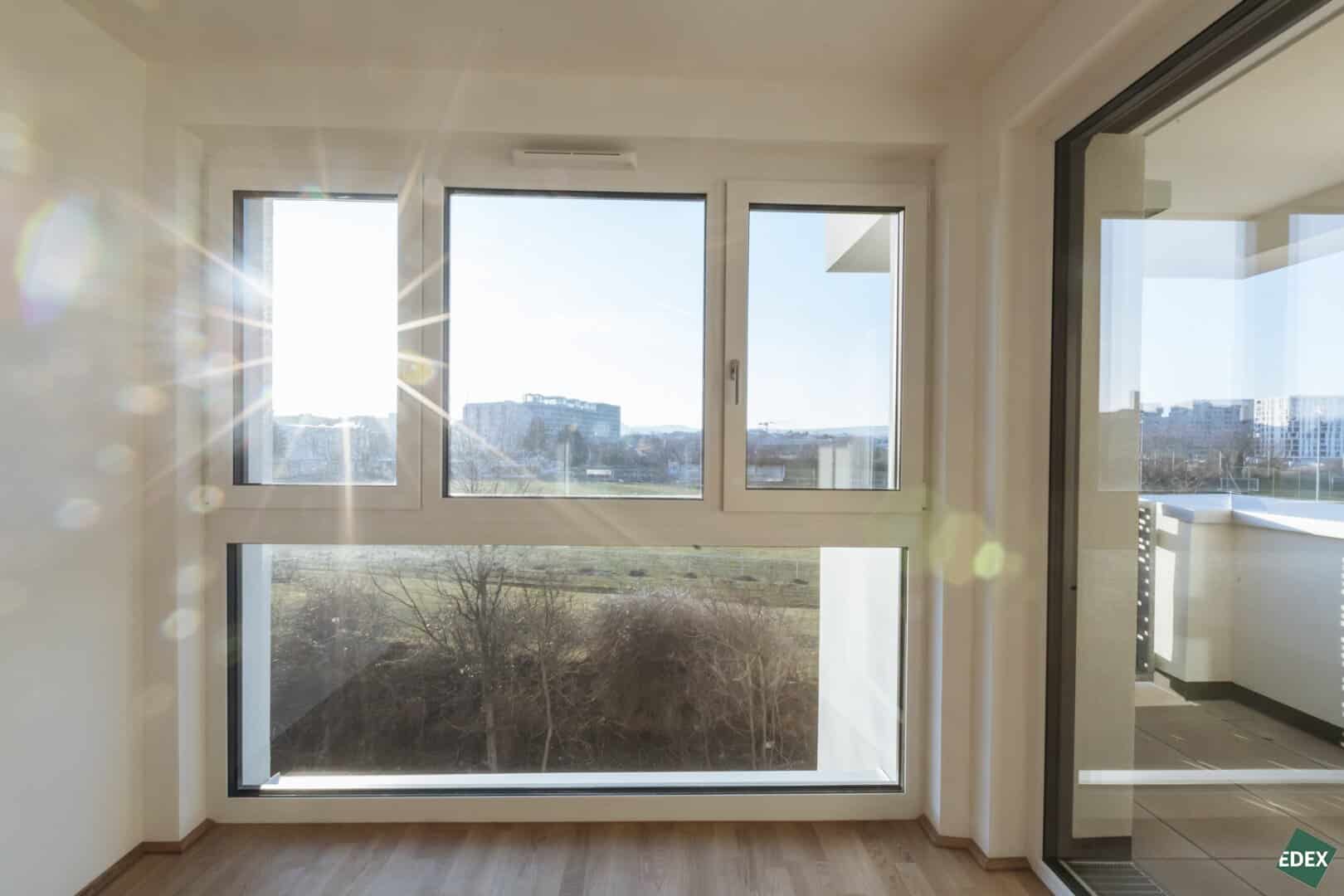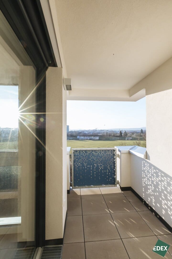 Genießen Sie entspannte Momente auf dem ca. 3,56 m² großen, teilweise überdachten Balkon in westlicher Ausrichtung, von dem aus Sie den Sonnenuntergang erleben können. Die Wohnung zeichnet sich besonders durch ihre bodentiefen Fenster und die ruhige Lage mit Blick ins Grüne aus.