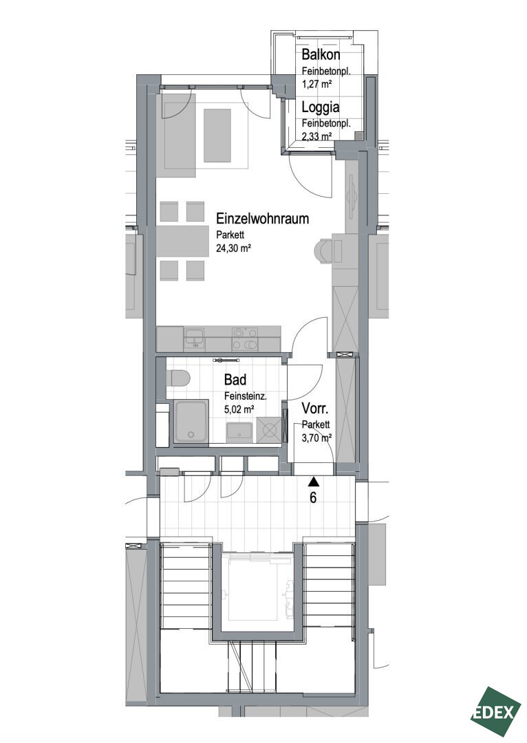 - TOP 6: ca. 33,02 m² 1-Zimmer-Wohnung mit 1,23 m² Balkon/2,33 m² Loggia