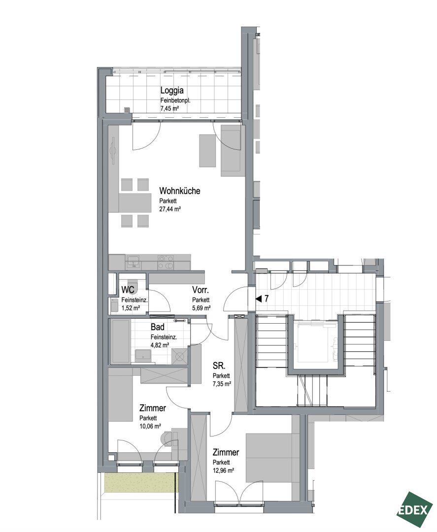 - TOP 7: ca. 69,84 m² 3-Zimmer-Wohnung mit 7,45 m² Loggia