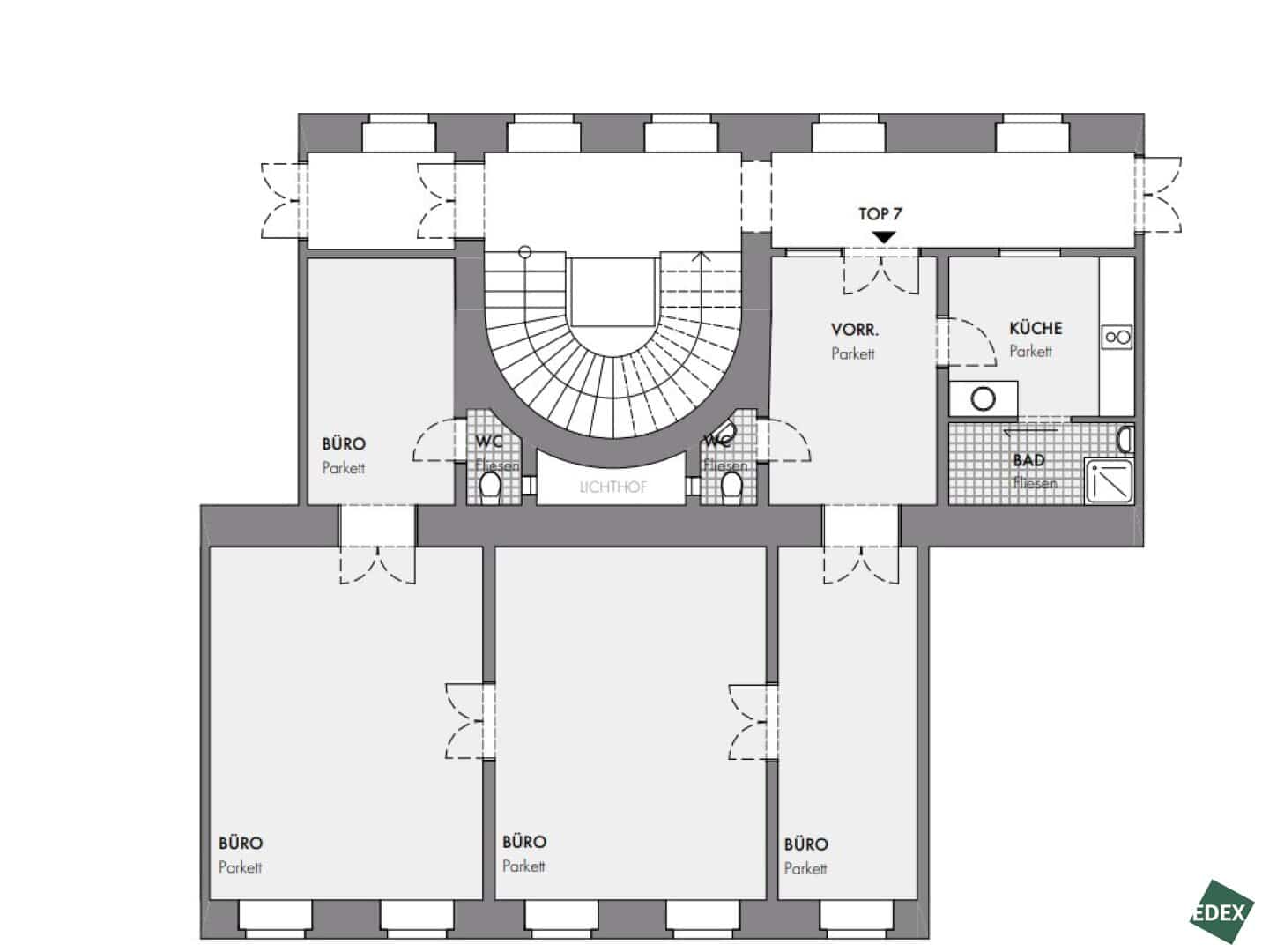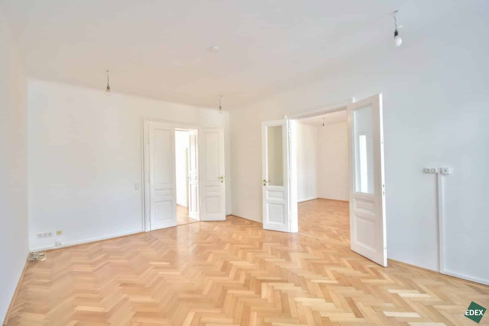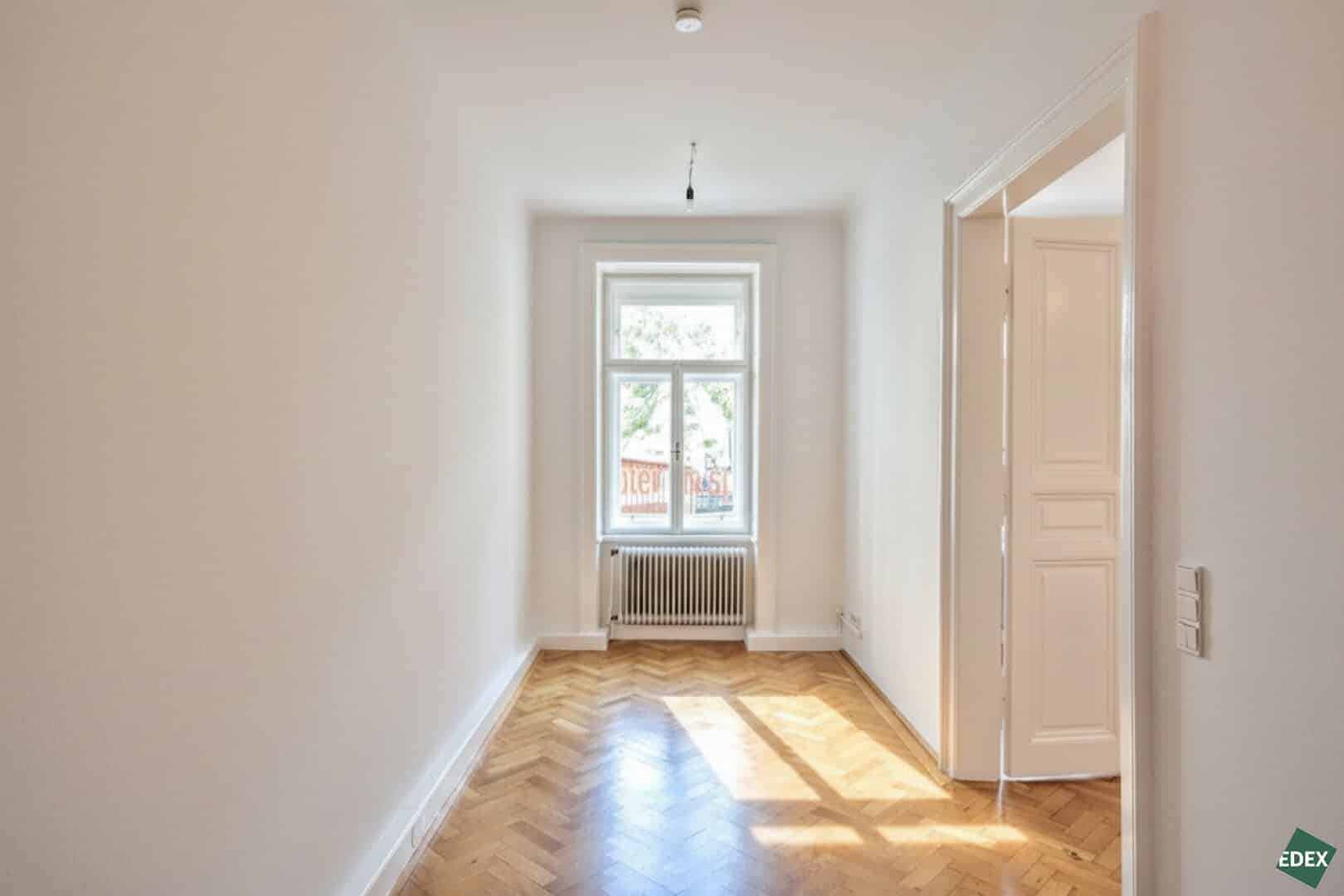 Die straßenseitig zur Spittelberggasse ausgerichteten Büroräume überzeugen durch klassische Altbauelemente wie Flügeltüren und Fischgrätparkett und schaffen eine angenehme Arbeitsatmosphäre mit besonderem Charakter.