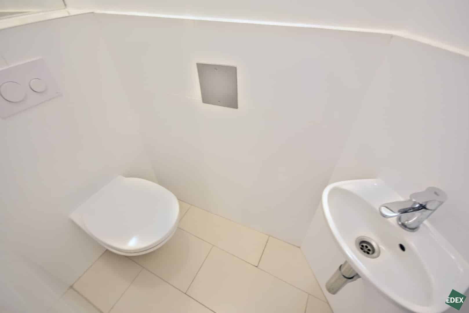 Im hinteren Bereich befindet sich ein weiterer Raum, der sich optimal als Archiv oder Lager nutzen lässt, ebenso wie das zweite WC. Die Küche ist funktional angelegt und bietet zudem Zugang zu einem kleinen Badezimmer mit Dusche.
