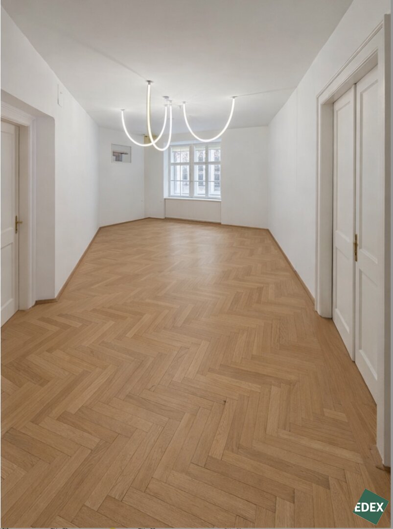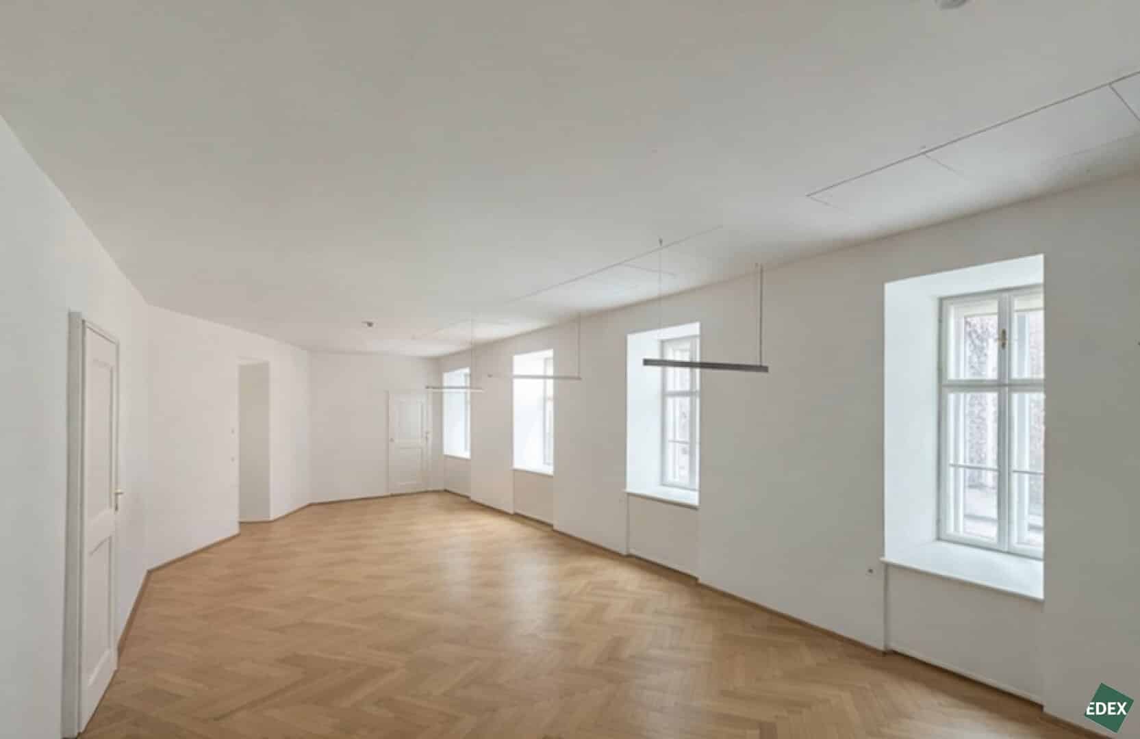 Die Fläche befindet sich im 1. Obergeschoss eines gepflegten Altbaus mit Lift und überzeugt durch klassische Elemente wie Fischgrätparkett sowie eine moderne Klimatisierung.