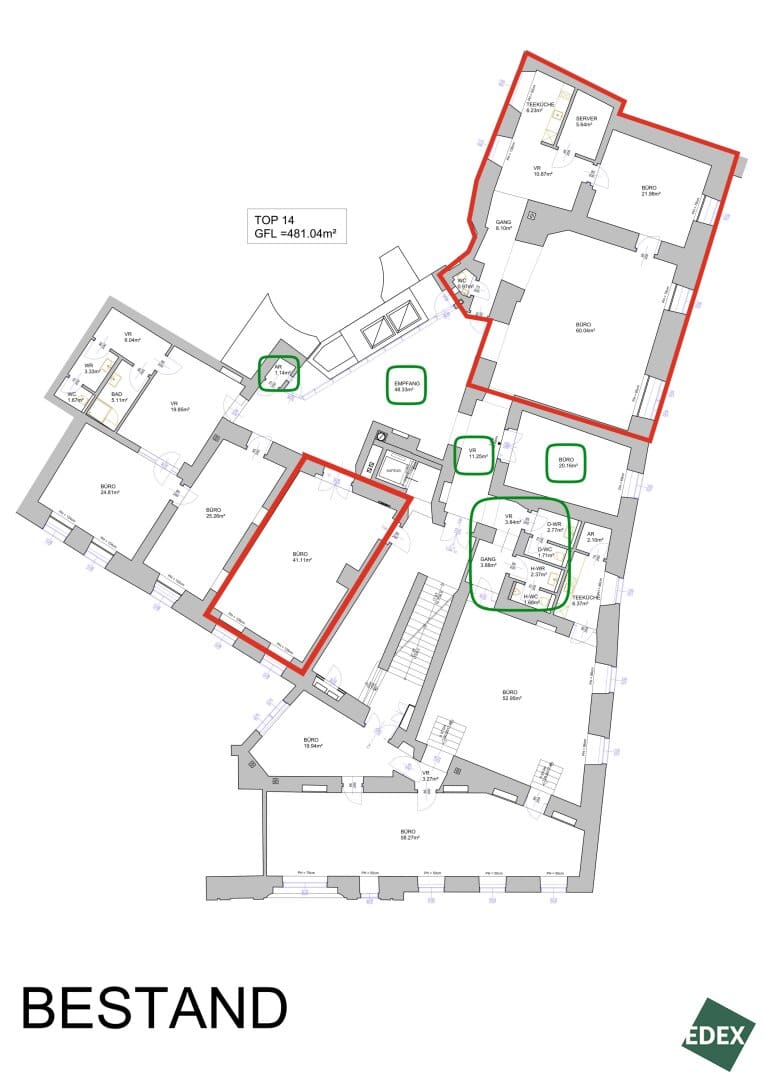 Die exklusiv nutzbare Bürofläche umfasst rund 139 m²; zusätzlich werden gemeinsam genutzte Bereiche wie getrennte WC-Einheiten, Gang und Empfang anteilig mit ca. 16,25 m² angerechnet, sodass sich eine Gesamtfläche von ca. 155,88 m² ergibt.