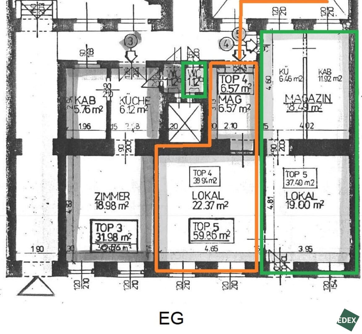 Die Flächen liegen nebeneinander im EG. Top 5 verfügt über einen straßenseitigen Eingang, sowie einen Zugang aus dem Stiegenhaus. Top 4 hat einen Zugang über das Stiegenhaus. Zusätzlich befindet sich im Stiegenhaus auch ein Gang-WC, das dem Geschäftslokal zugeordnet ist.
