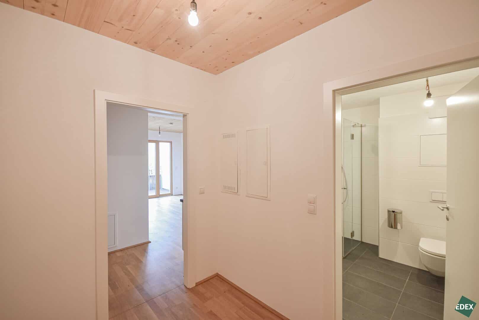 Die hochwertige Ausstattung umfasst sichtbare Holzelemente, Holzfenster mit 3-fach-Verglasung und elektrischer Außenbeschattung, Echtholz-Parkettböden sowie stilvolle Fliesen in den Nassräumen.