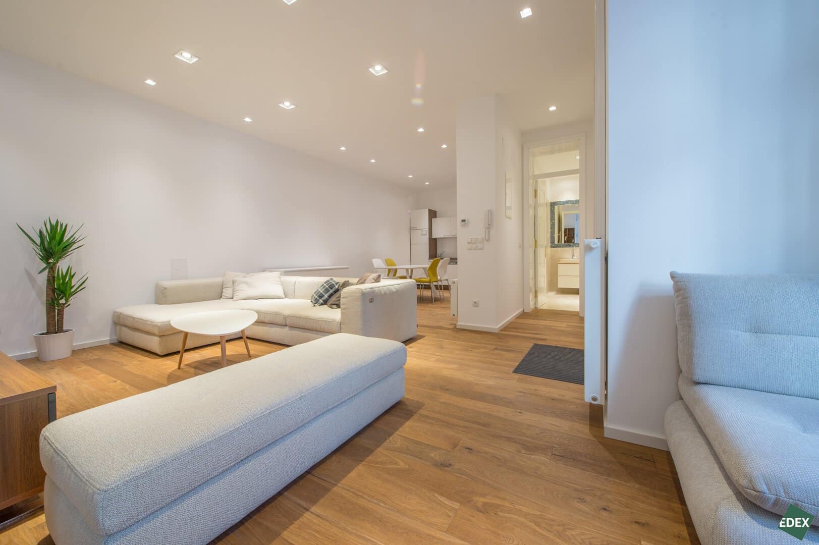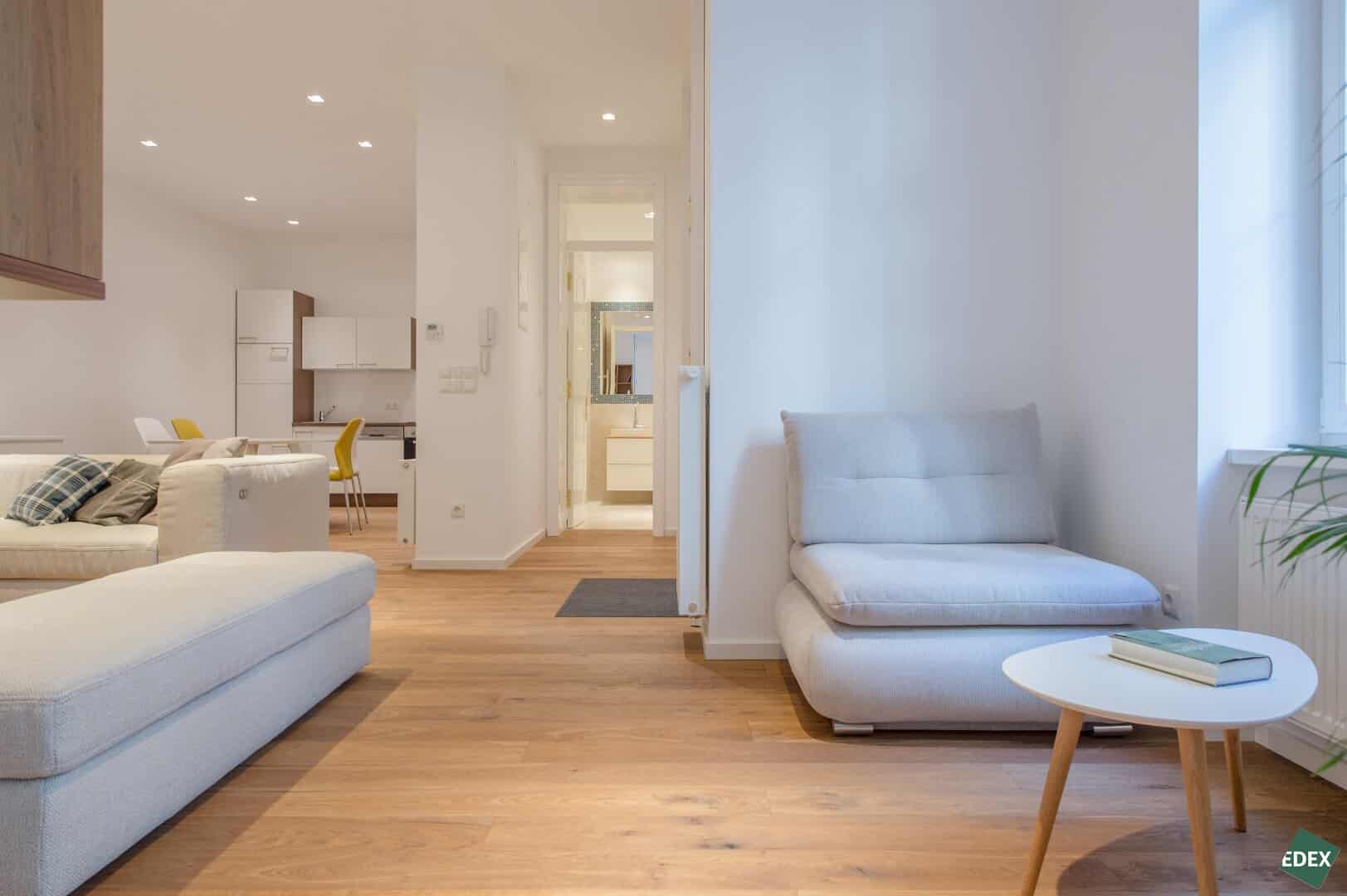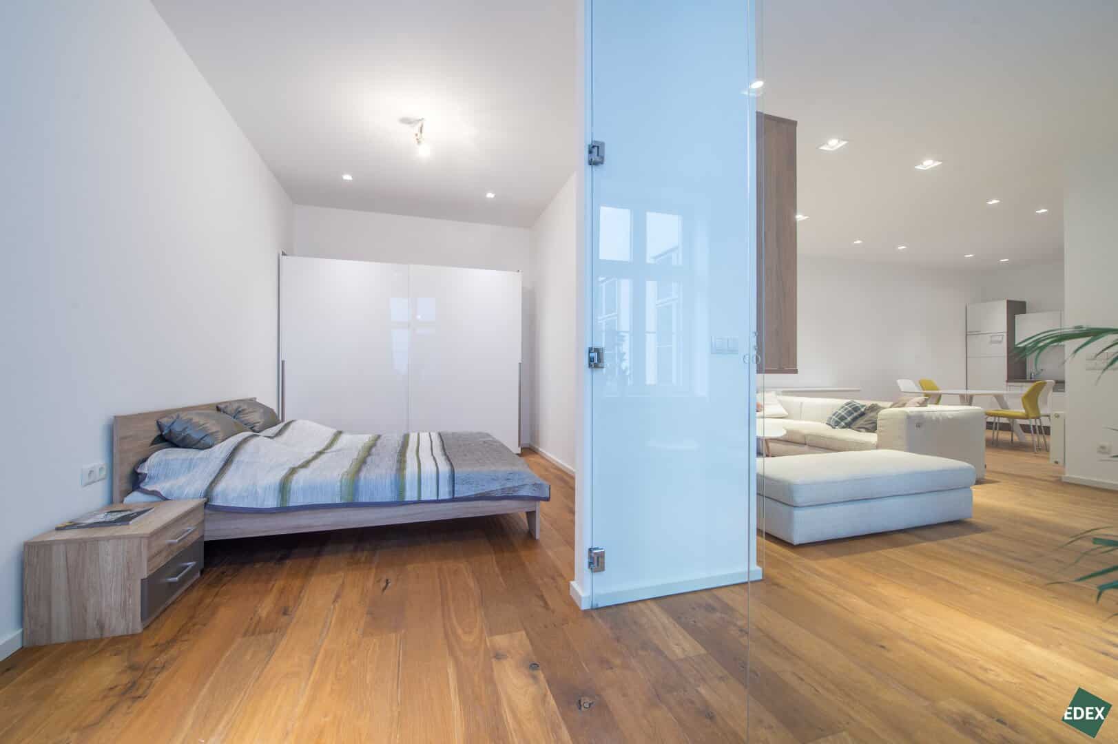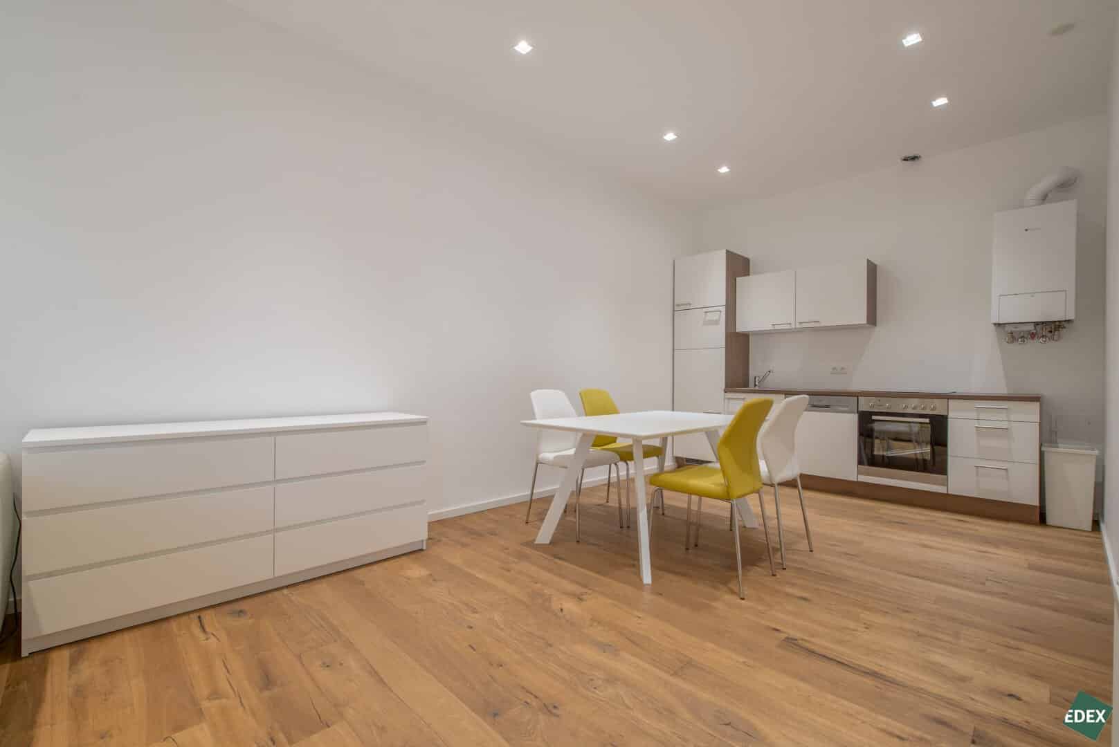 In der Decke befinden sich geschickt verteilte LED Spots, die nicht nur für optimale Beleuchtung sorgen, sondern auch mit geringem Stromverbrauch punkten. Darüber hinaus wurden im Zuge der letzten Sanierung die Fenster sowie die Eingangstür erneuert. Ein geschmackvolles Bad mit Marken-Sanitäreinrichtungen (Villeroy&Boch und Grohe) und ein geschickt abgetrennter Schlafbereich geben der Wohnung den letzten Schliff. Für zusätzlichen Freiraum wäre ein Balkonanbau auf eigene Kosten möglich.
