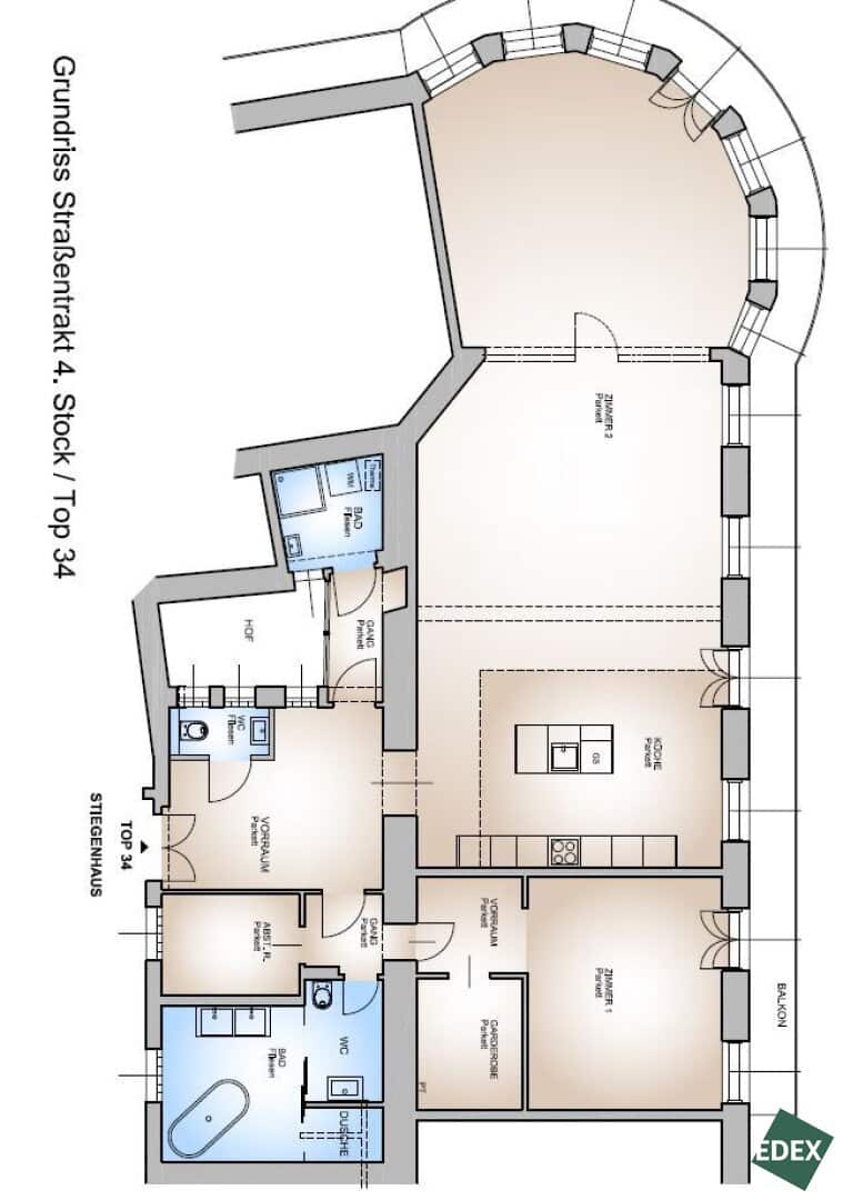 Der Vorraum, sowie die Zimmer sind mit schönem Parkettboden ausgestattet, die Badezimmer und das WC sind verfliest.