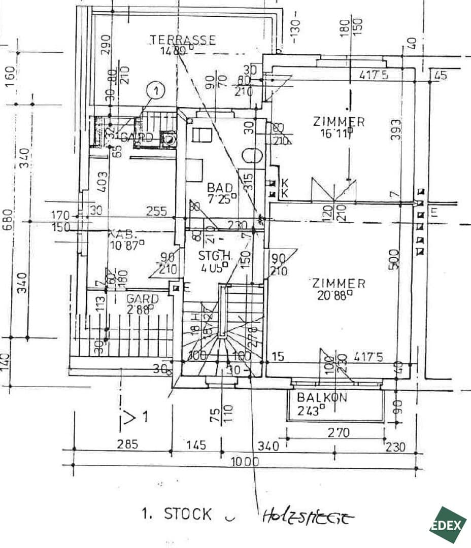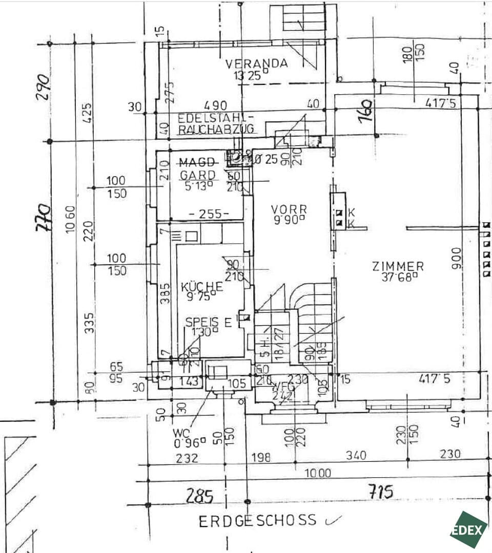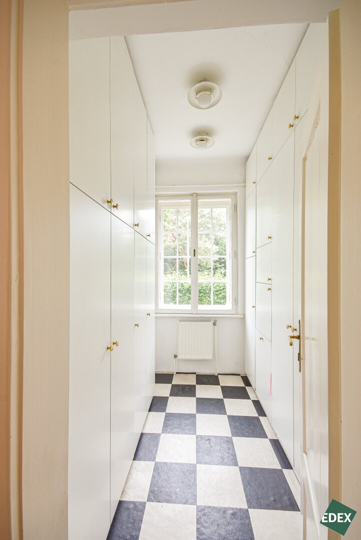 EG: Im Erdgeschoss befindet sich das ausladene Wohnzimmer (37 m²), eine Küche mit modernen Geräten sowie eine angrenzenden Speisekammer, eine große Gardarobe inkl. Kästen sowie ein kleineres Zimmer mit Kamin und Zugang zum Garten. Zusätzlich ist neben der Eingangstüre ein Gäste-WC.