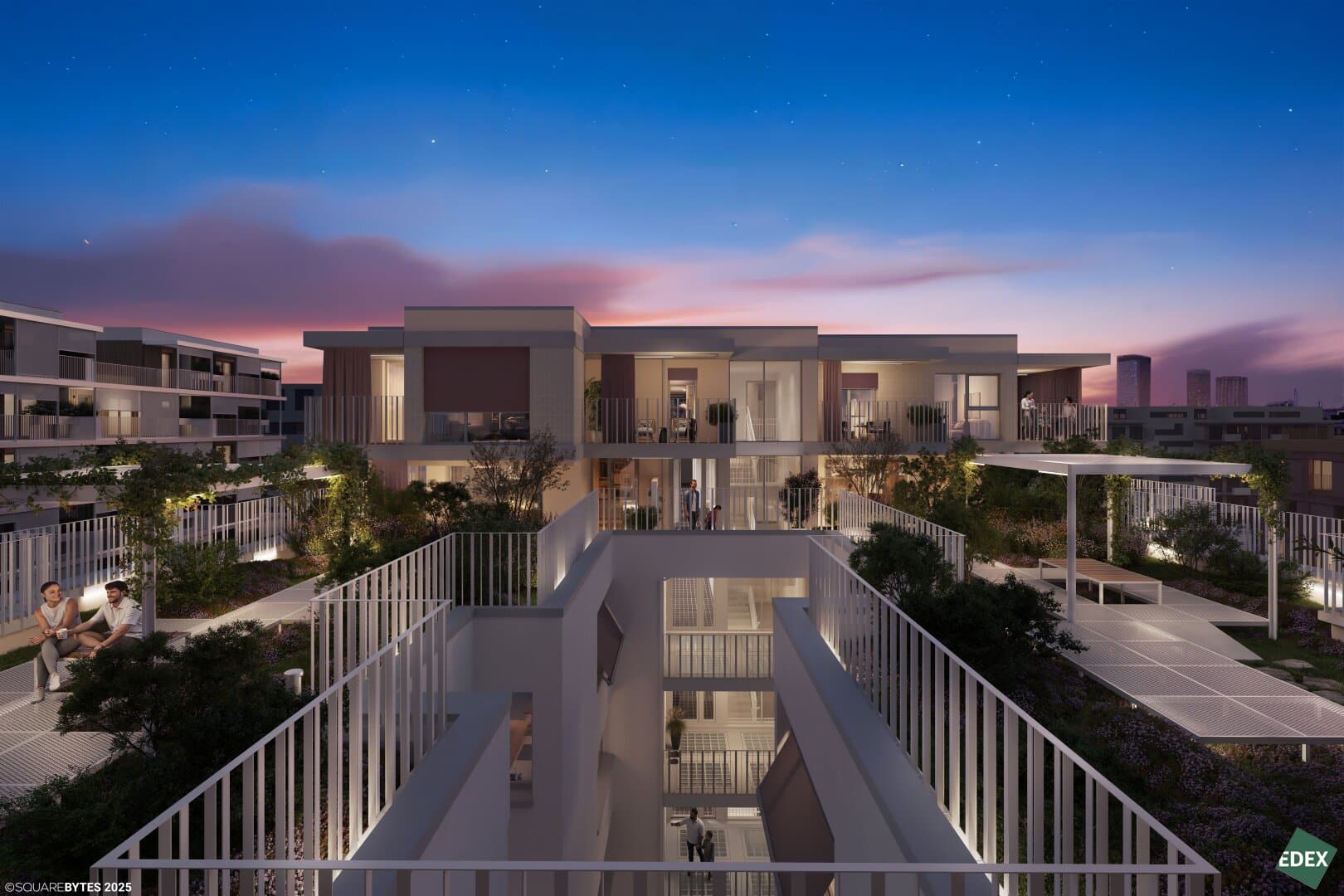 Ein besonderes Highlight ist der offene Atriumbereich im Erdgeschoss, der als „Grüne Mitte“ fungiert, die Architektur auflockert und Begegnungszonen schafft. Im 4. Obergeschoss verbindet ein begrünter Dachgarten die beiden Bauteile – ein Ort des Rückzugs ebenso wie des Austauschs. Pergolen und grüne Oasen verwandeln ihn in eine urbane Ruhezone mit hoher Aufenthaltsqualität.
